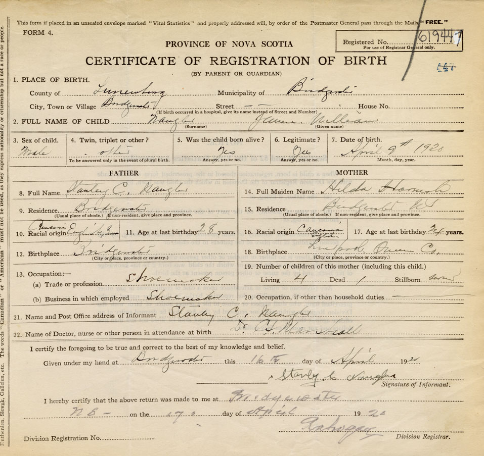 21. Name and Post Office address of Informant Stanley C. Naugler Bridgewater, Lunenburg Co.