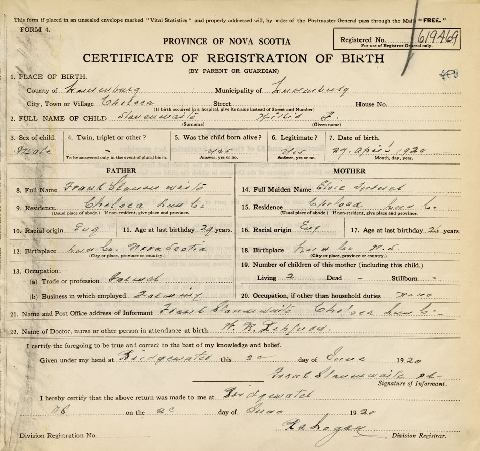21. Name and Post Office address of Informant Frank Slauenwaite Chelsea, Lunenburg Co.