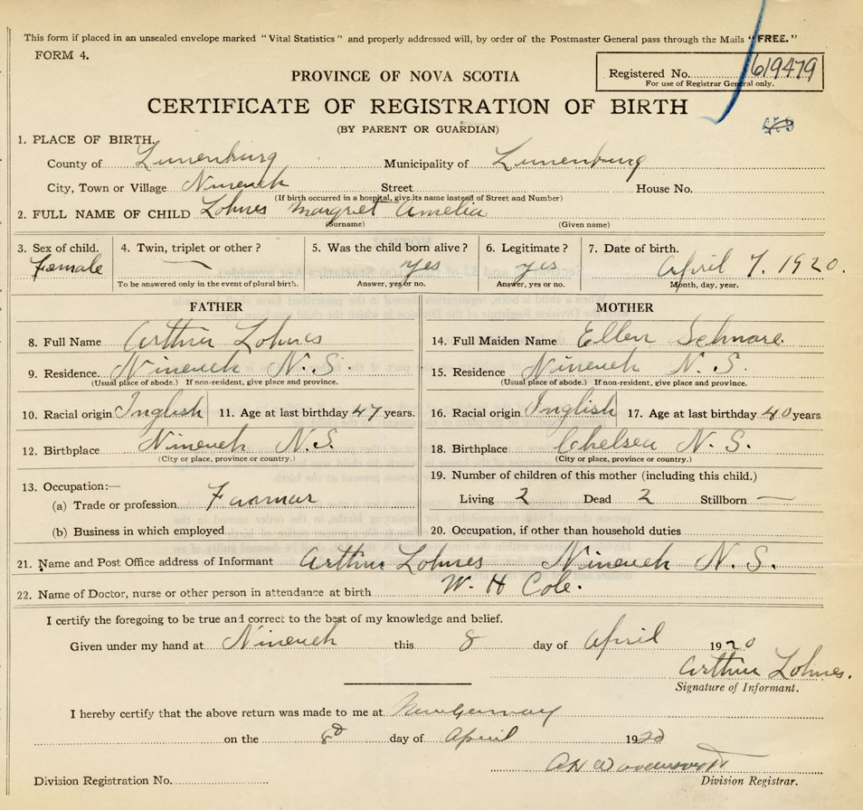 21. Name and Post Office address of Informant Arthur Lohnes Nineveh, Lunenburg Co.