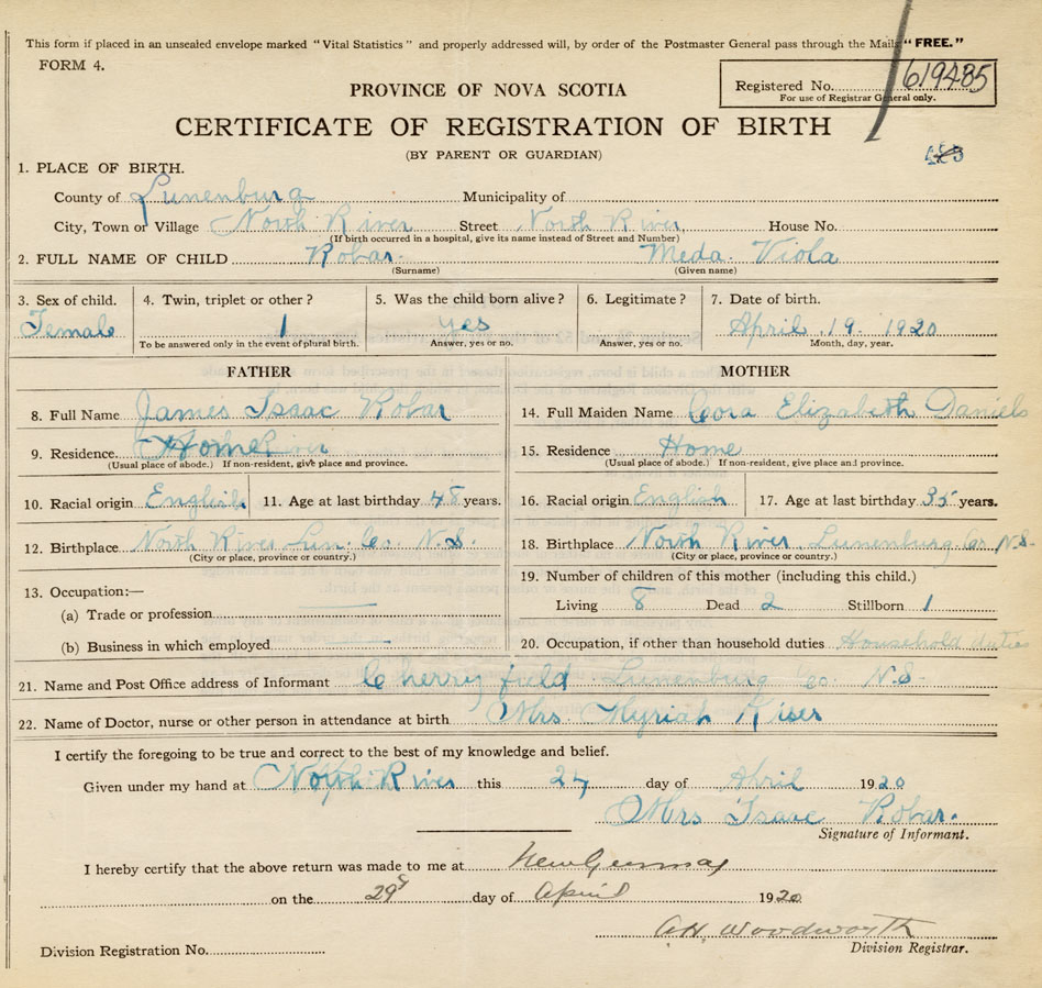 21. Name and Post Office address of Informant Mrs Isaac Robar North River, Lunenburg Co.