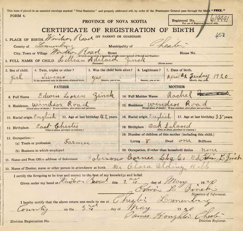 21. Name and Post Office address of Informant Edwin L. Zinck Robisons Corner, Lunenburg Co.