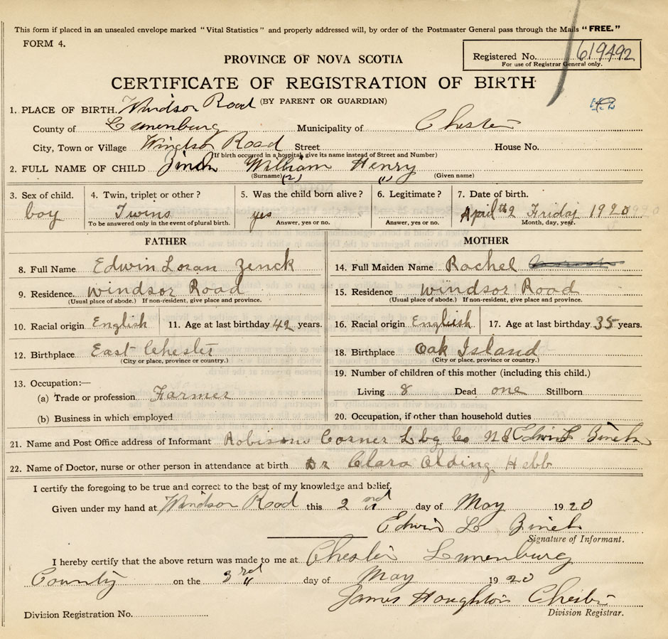 21. Name and Post Office address of Informant Edwin L. Zinck Robisons Corner, Lunenburg Co.