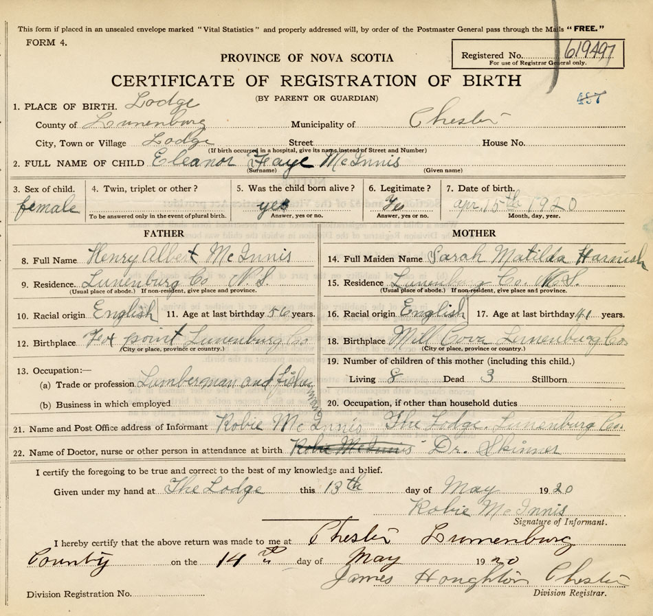 21. Name and Post Office address of Informant Robie McInnis The Lodge Lunnenburg Co