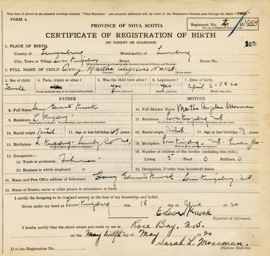 21. Name and Post Office address of Informant Henry Edward Knock Lower Kingsburg NS