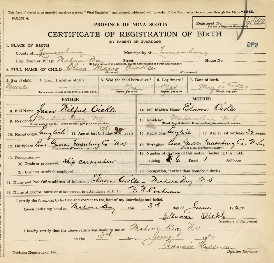 21. Name and Post Office address of Informant Wlnora Oickle Mahone Bay