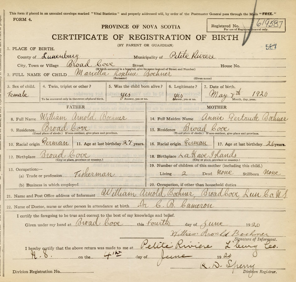 21. Name and Post Office address of Informant William Arnold Boehner Broad Cove, Lun Co. N.S.