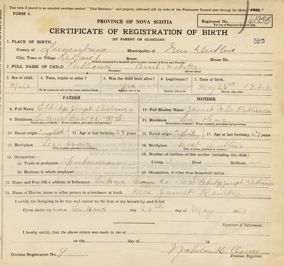 21. Name and Post Office address of Informant Eldridge Joseph Publicover La Have, Lun. Co
