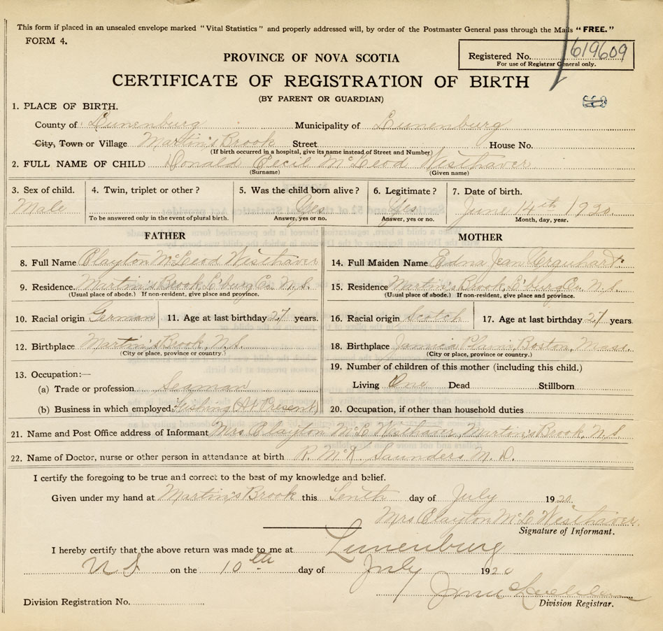 21. Name and Post Office address of Informant Mrs Clayton McL Westhaver Martins Brook NS