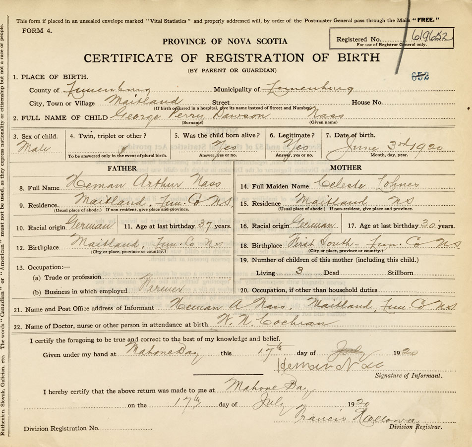 21. Name and Post Office address of Informant Herman A Nass Maitland, Lun. Co NS