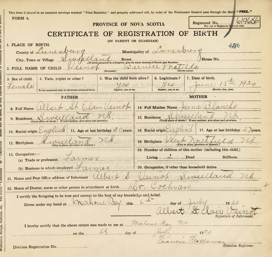 21. Name and Post Office address of Informant Albert S Veinot Sweetland, Lunenberg County