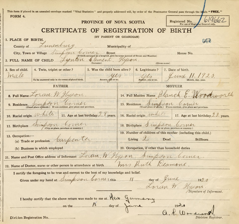 21. Name and Post Office address of Informant Loran W. Hyson Simpson Corner, Lunenburg Co.