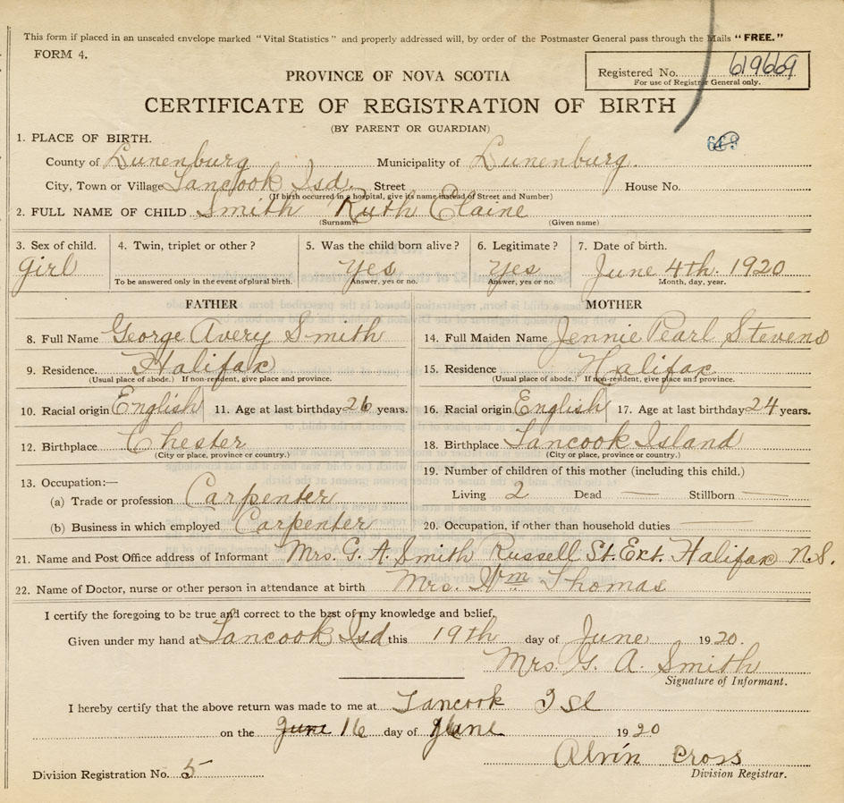 21. Name and Post Office address of Informant Mrs. G.A. Smith Russell St. Ext. Halifax