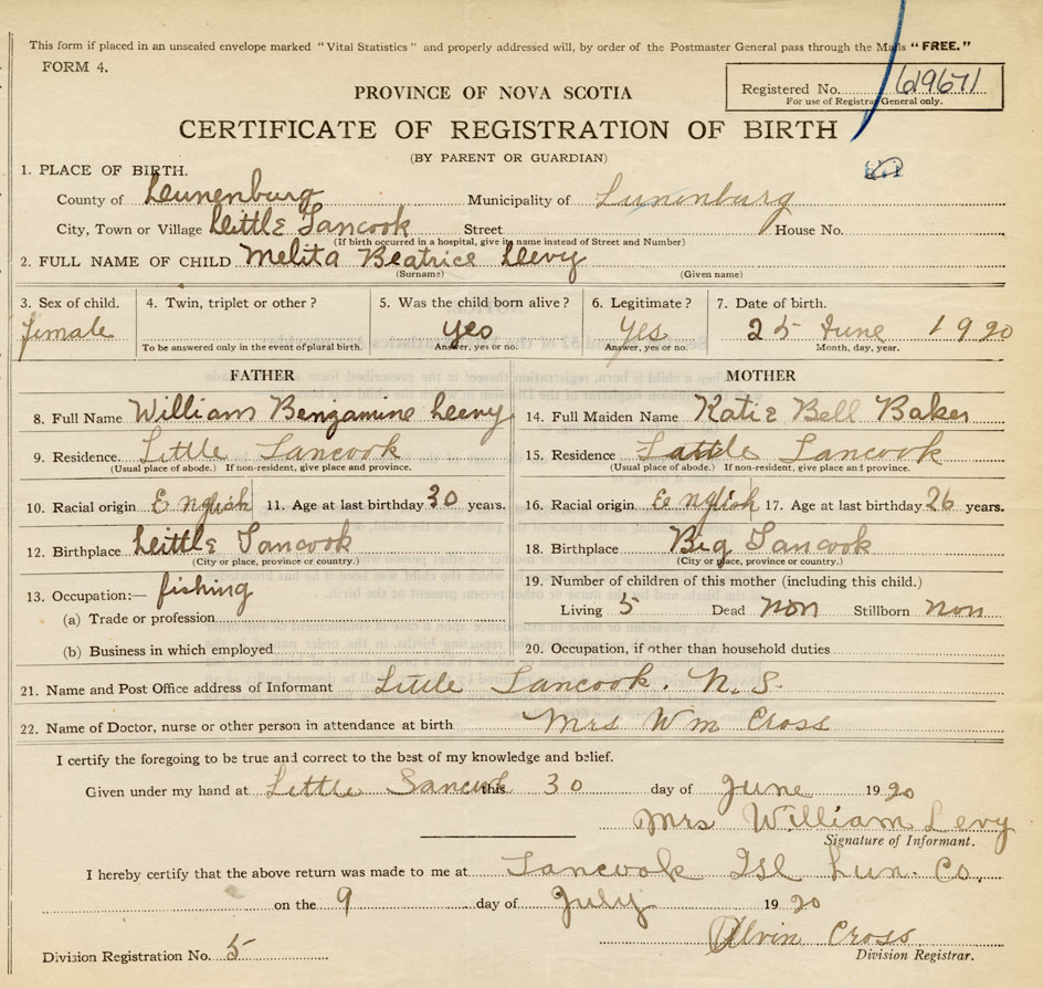 21. Name and Post Office address of Informant Mrs. William Levy Little Tancook