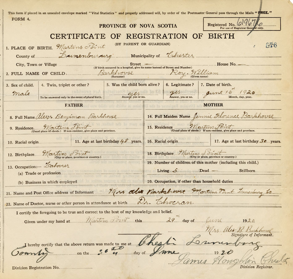 21. Name and Post Office address of Informant Mrs. A. Barkhouse Martins Point