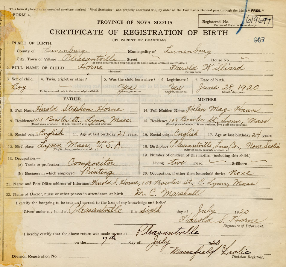21. Name and Post Office address of Informant Harold S. Horne 103 Bowler St. E., Lynn, Mass. USA