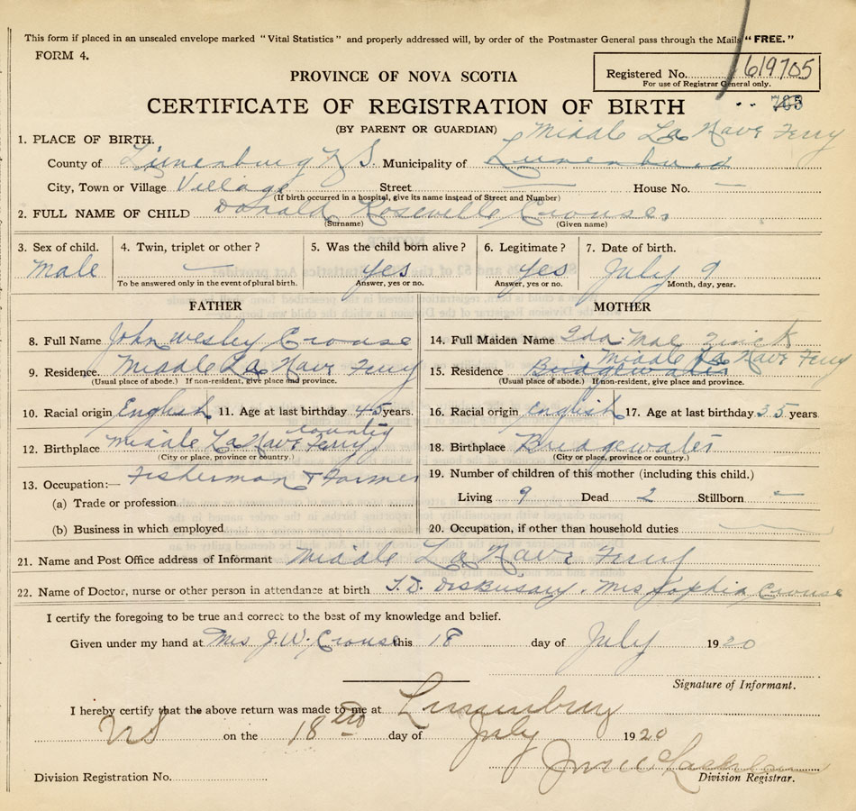 21. Name and Post Office address of Informant Mrs J.W. Crouse Middle LaHave Ferry