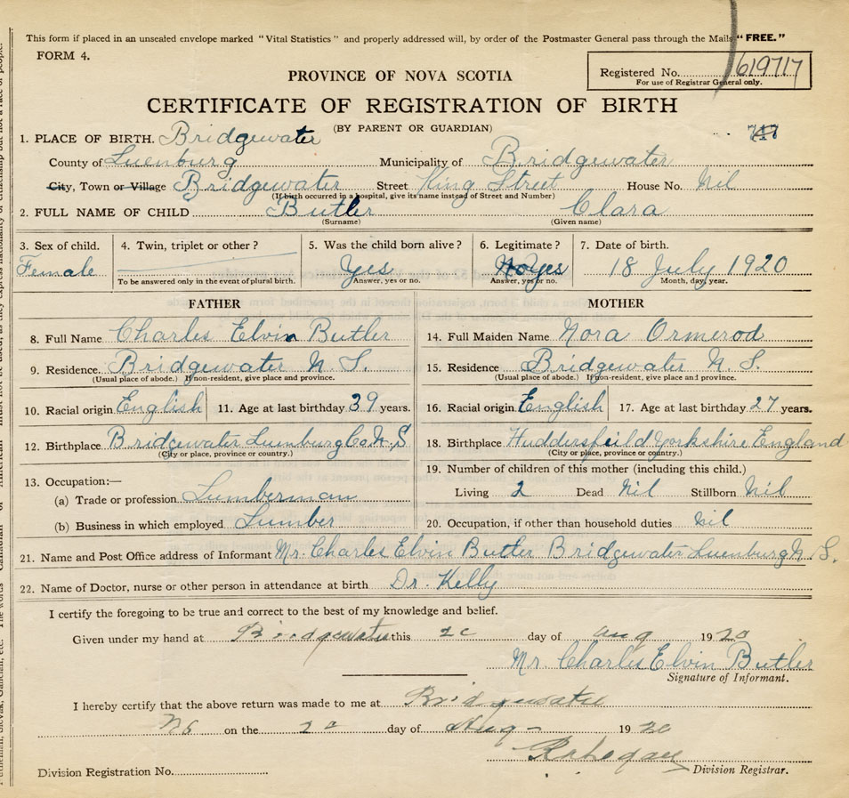 21. Name and Post Office address of Informant Charles Elvin Butler Bridgewater, Lunenburg Co.