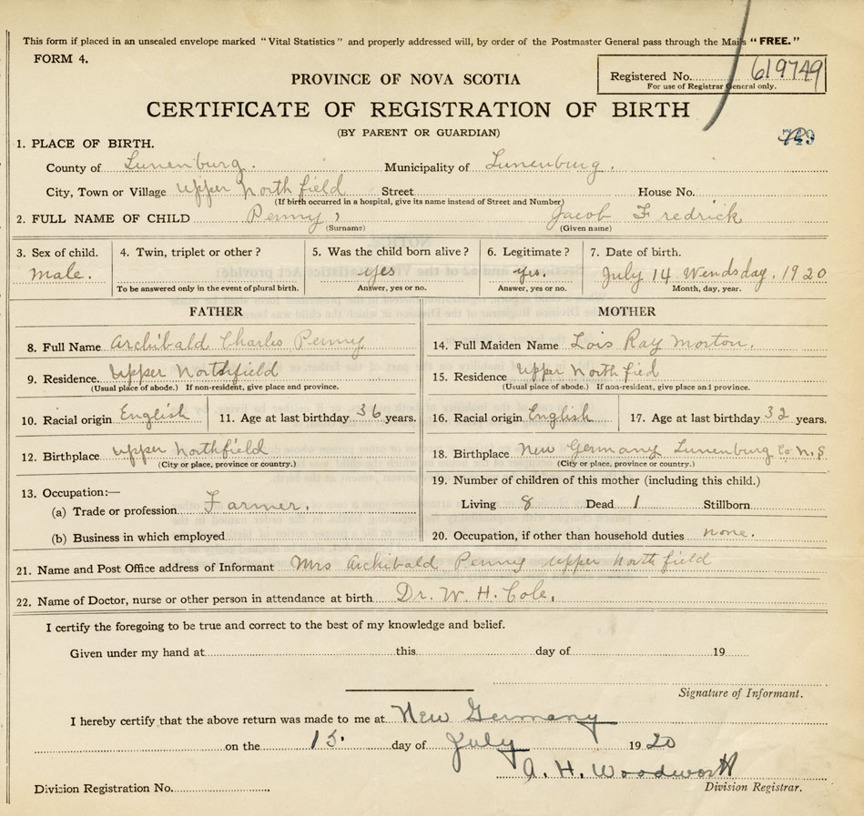 21. Name and Post Office address of Informant Mrs. Archibald Penny Upper Northfield, Lunenburg Co.