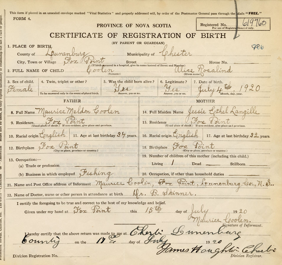 21. Name and Post Office address of Informant Maurice Coolen Fox Point, Lunenburg Co.