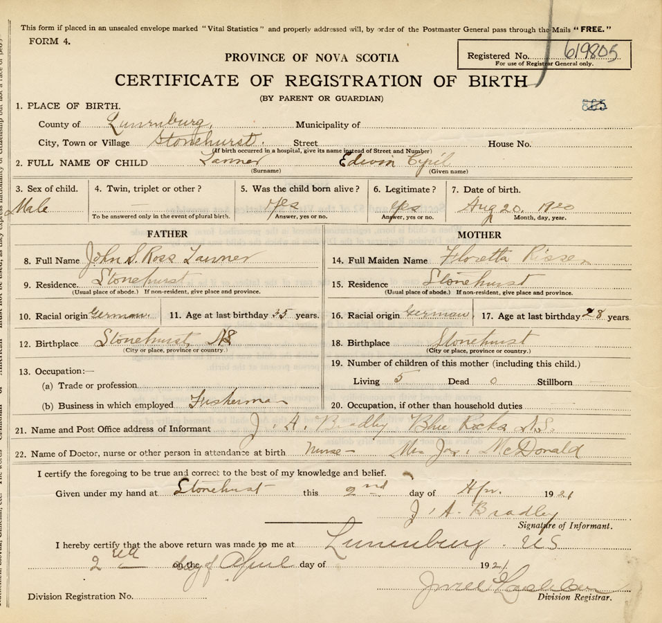 21. Name and Post Office address of Informant J. A. Bradley Blue Rocks N.S.