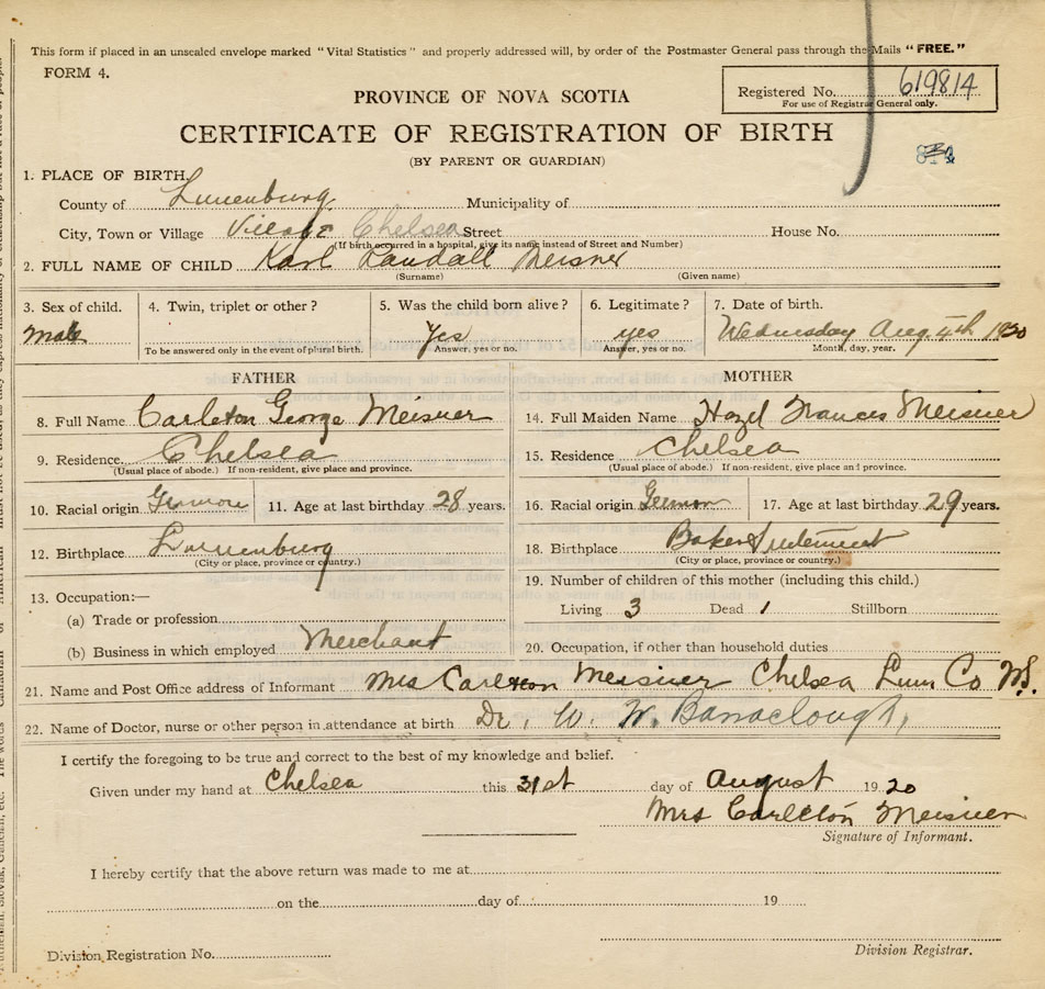21. Name and Post Office address of Informant Mrs. Carleton Meisner Chelsea, Lunenburg Co.