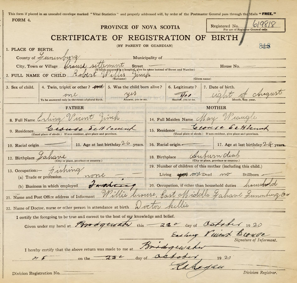 21. Name and Post Office address of Informant Willie Crouse East Middle LaHave, Lunenburg Co.