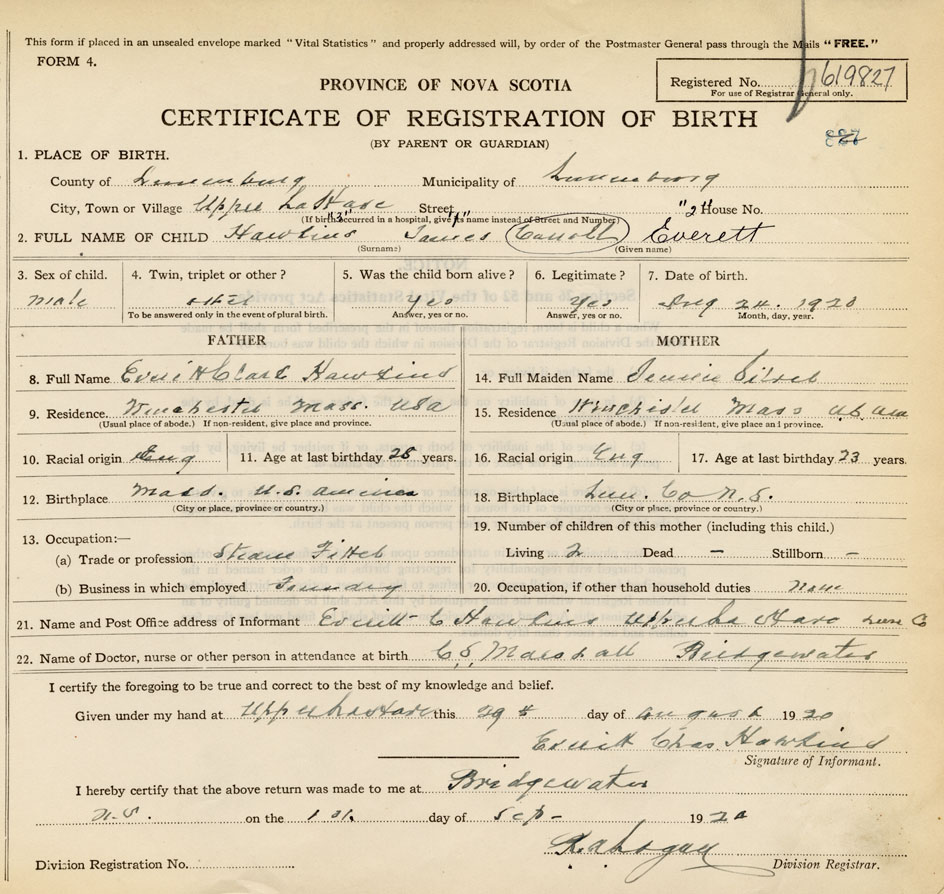 21. Name and Post Office address of Informant Everitt C. Hawkins Upper LaHave, Lunenburg Co.