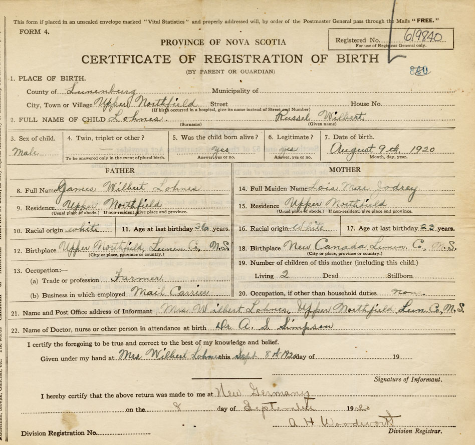 21. Name and Post Office address of Informant Mrs. Wilbert Lohnes Upper Northfield, Lunenburg Co.