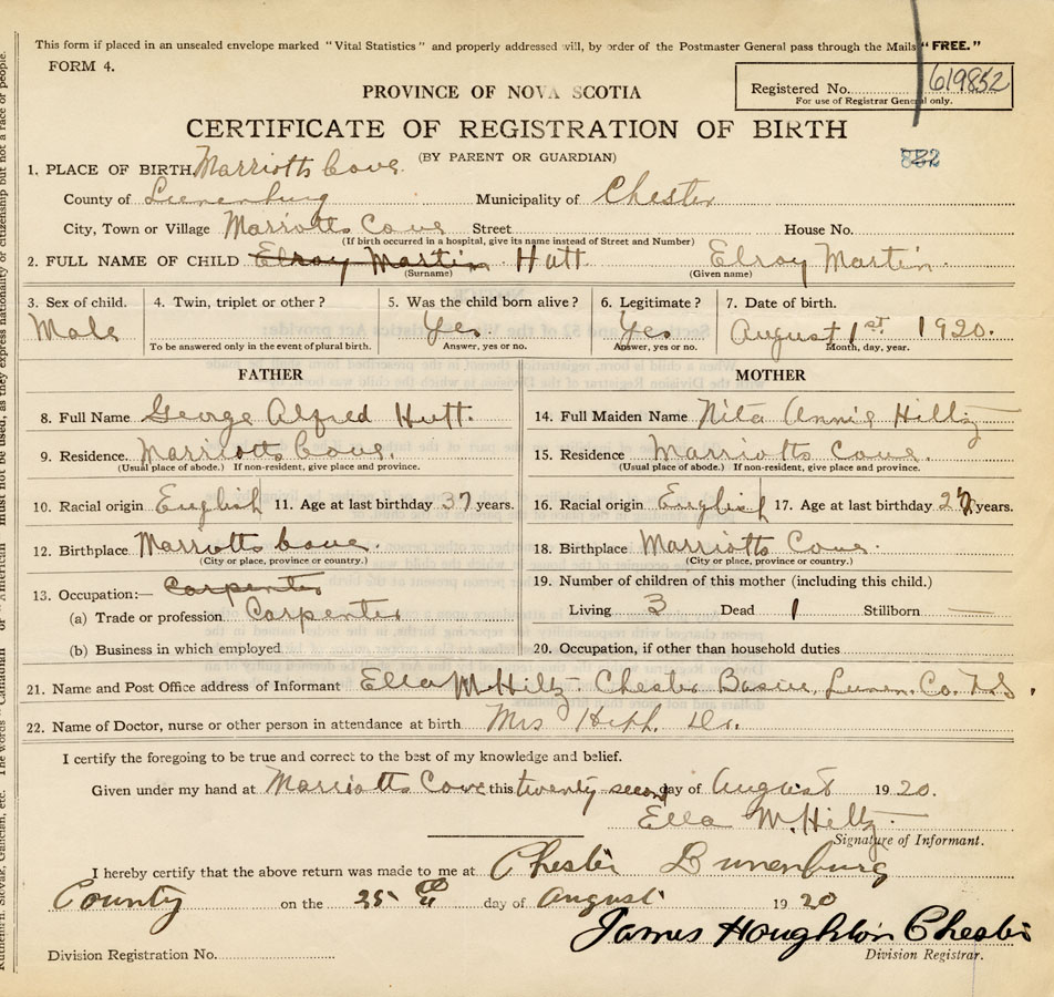 18. Birthplace Marriotts Cove, Lunenburg Co.