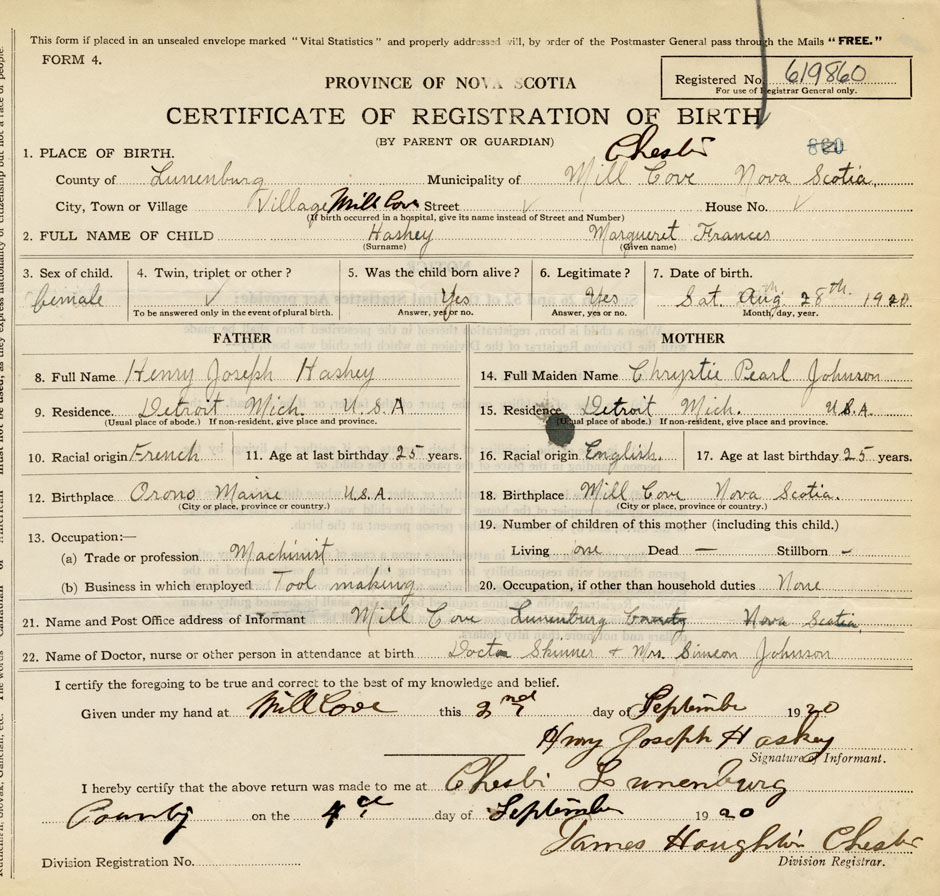 21. Name and Post Office address of Informant Henry Joseph Hashey Mill Cove, Lunenburg County