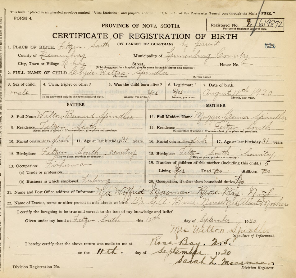 22. Name of Doctor, nurse or other person in attendance at birth Dr. G.A. Barss, Nurse Mrs. Albert Mosher