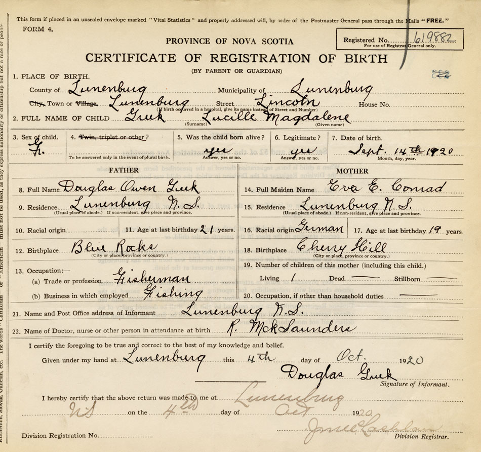 21. Name and Post Office address of Informant Douglas Greek Lunenburg