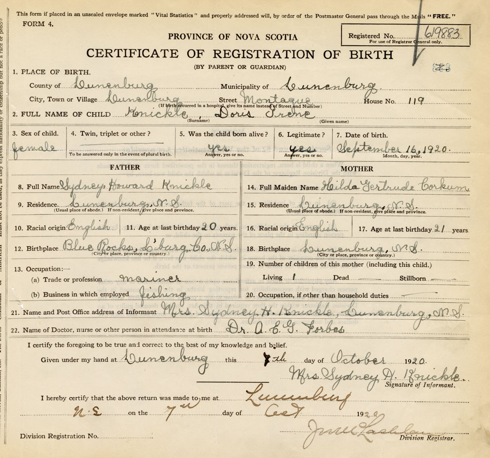 21. Name and Post Office address of Informant Mrs. Sydney H. Knickle Lunenburg