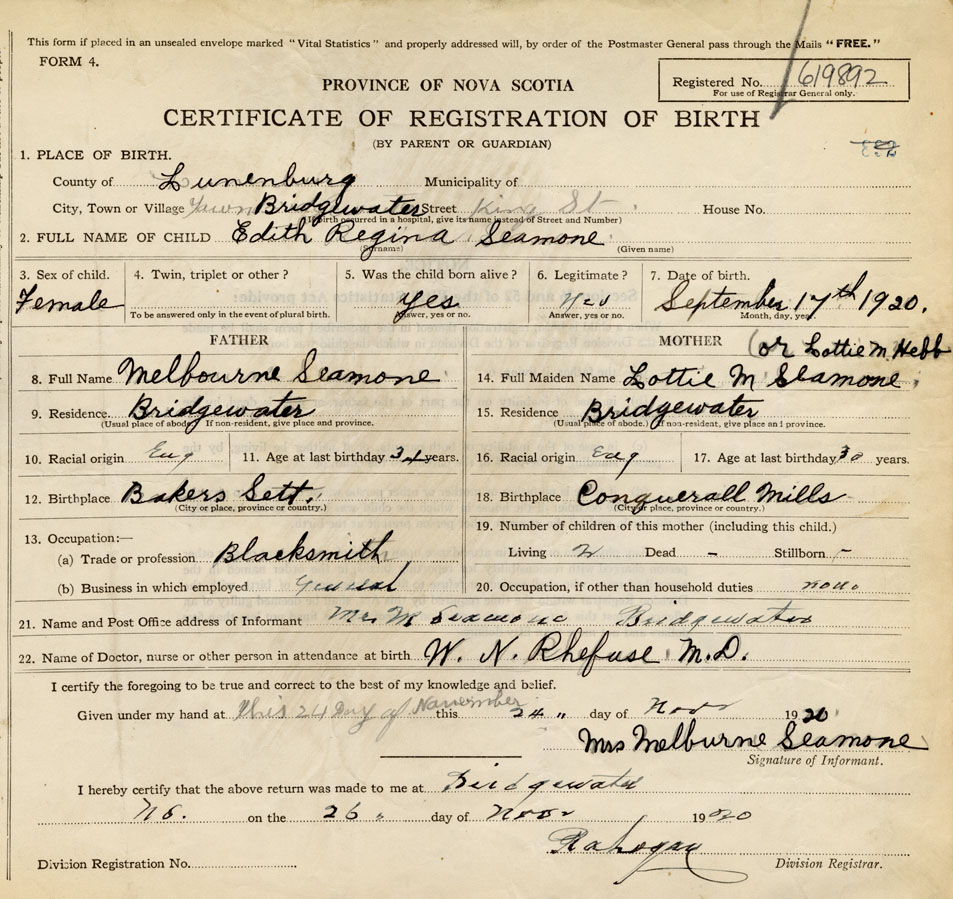 21. Name and Post Office address of Informant Mrs. M. Seamone Bridgewater, Lunenburg Co.