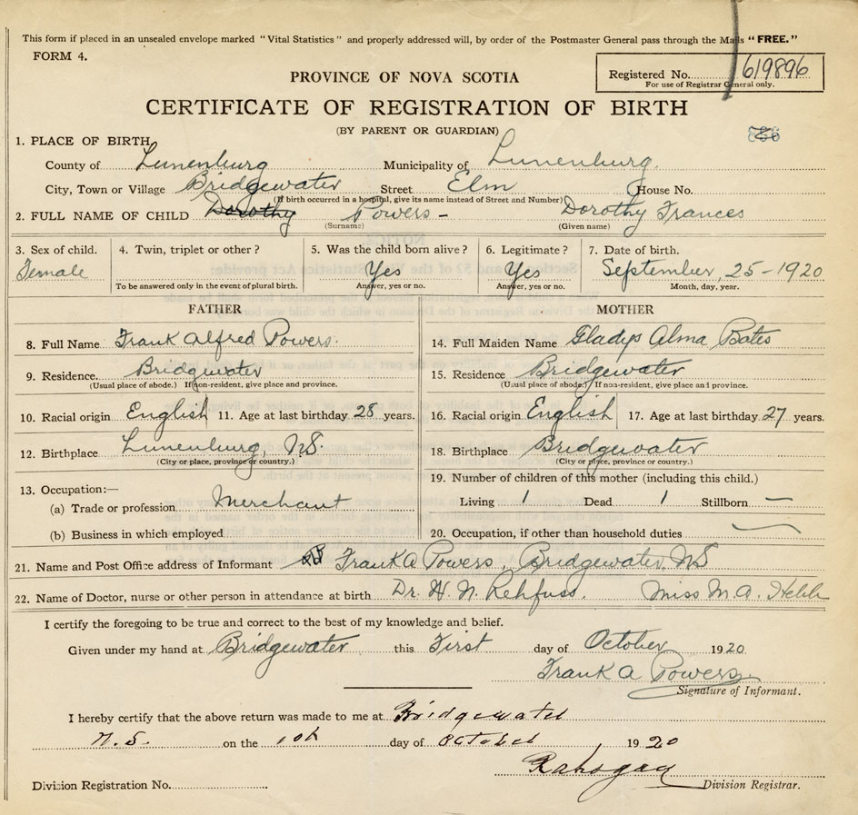 21. Name and Post Office address of Informant Frank A. Powers Bridgewater, Lunenburg Co.