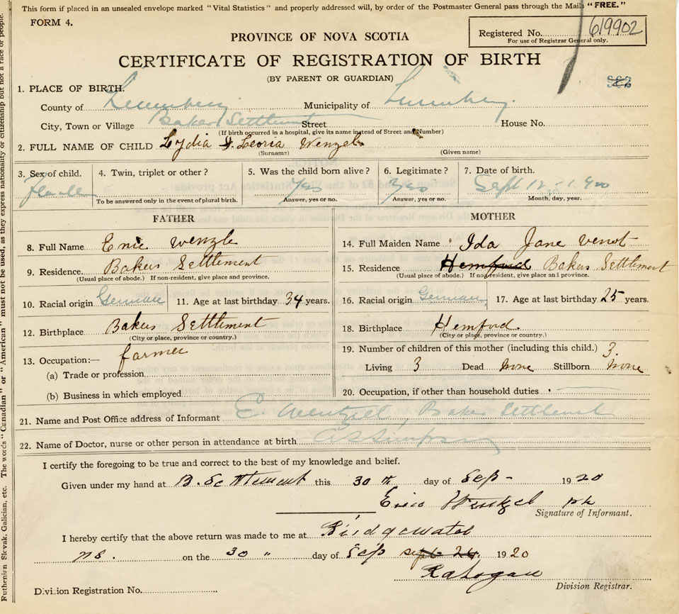 21. Name and Post Office address of Informant E. Wentzel Baker Settlement, Lunenburg Co.