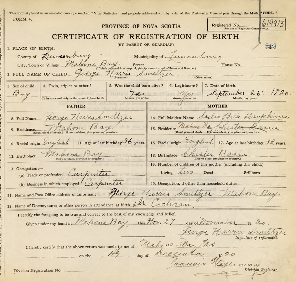 21. Name and Post Office address of Informant George Harris Smeltzer Mahone Bay, Lunenburg Co.