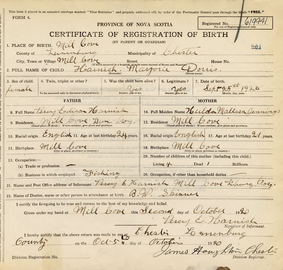 21. Name and Post Office address of Informant Percy E. Harnish Mill Cove, Lunenburg Co.