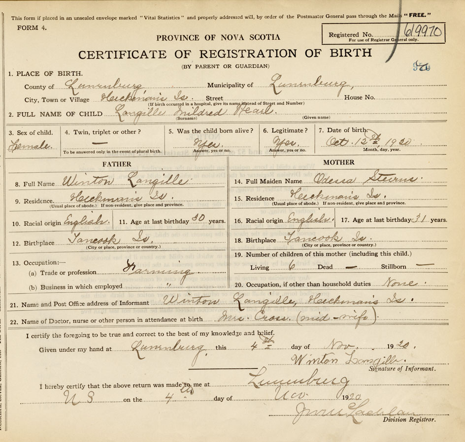 21. Name and Post Office address of Informant Winton Langille Heckmans Island