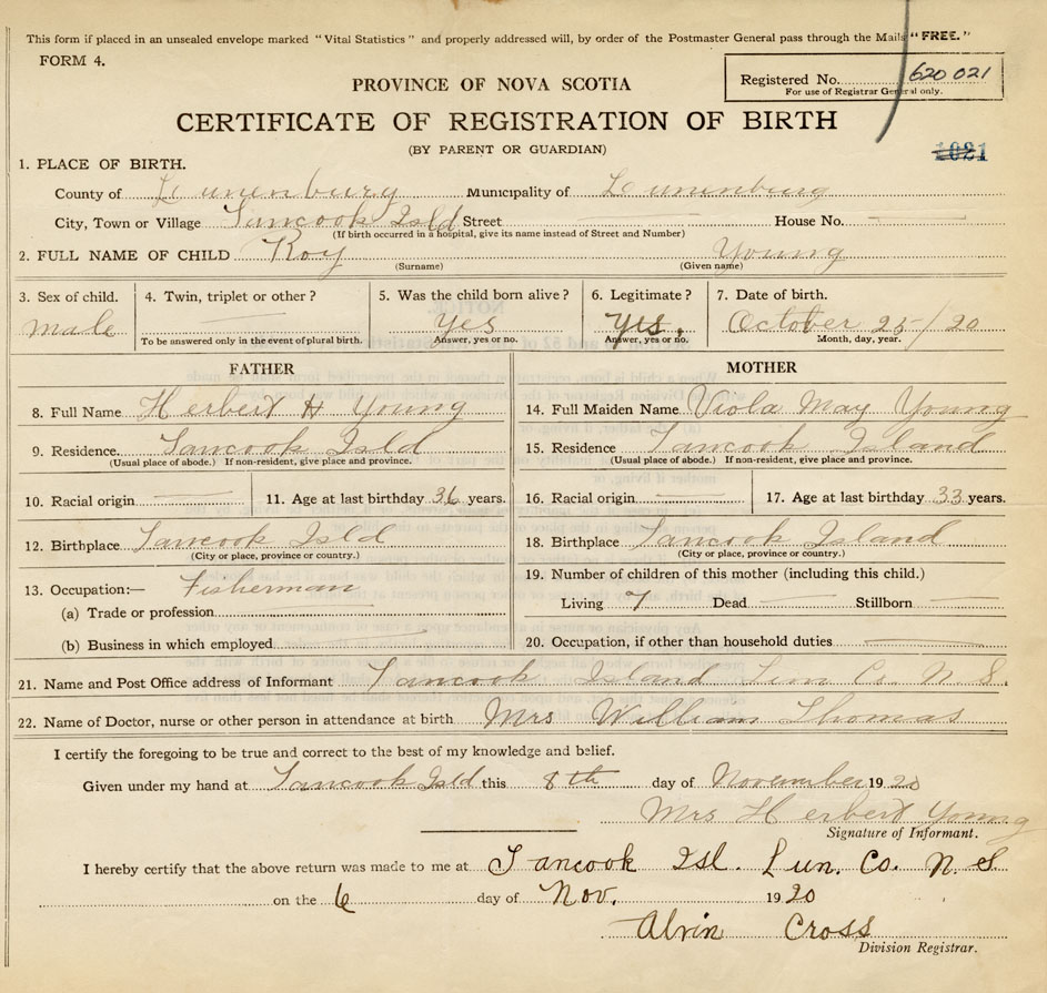 21. Name and Post Office address of Informant Mrs. Herbert Young Tancook Island