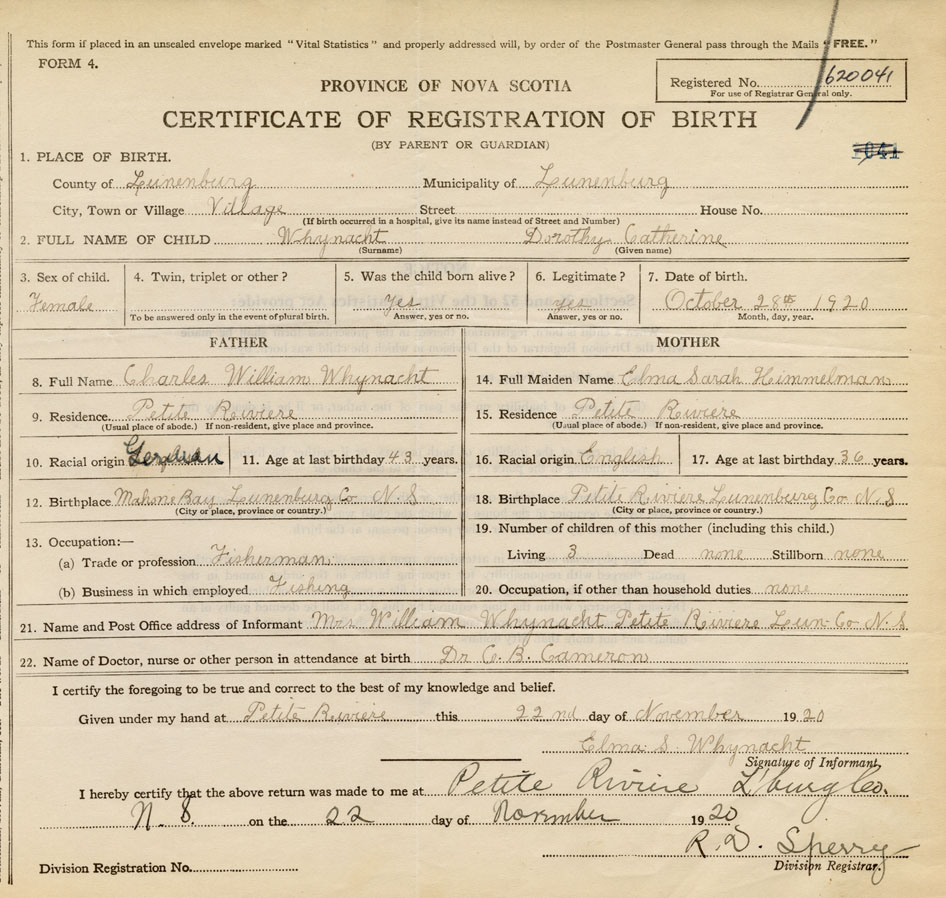 21. Name and Post Office address of Informant Mrs William Whynacht Petite Riviere Lunenburg County Nova Scotia