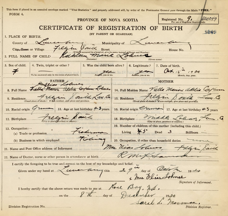 21. Name and Post Office address of Informant Mrs. Elias Lohnes Feltzen South, Lunenburg Co.