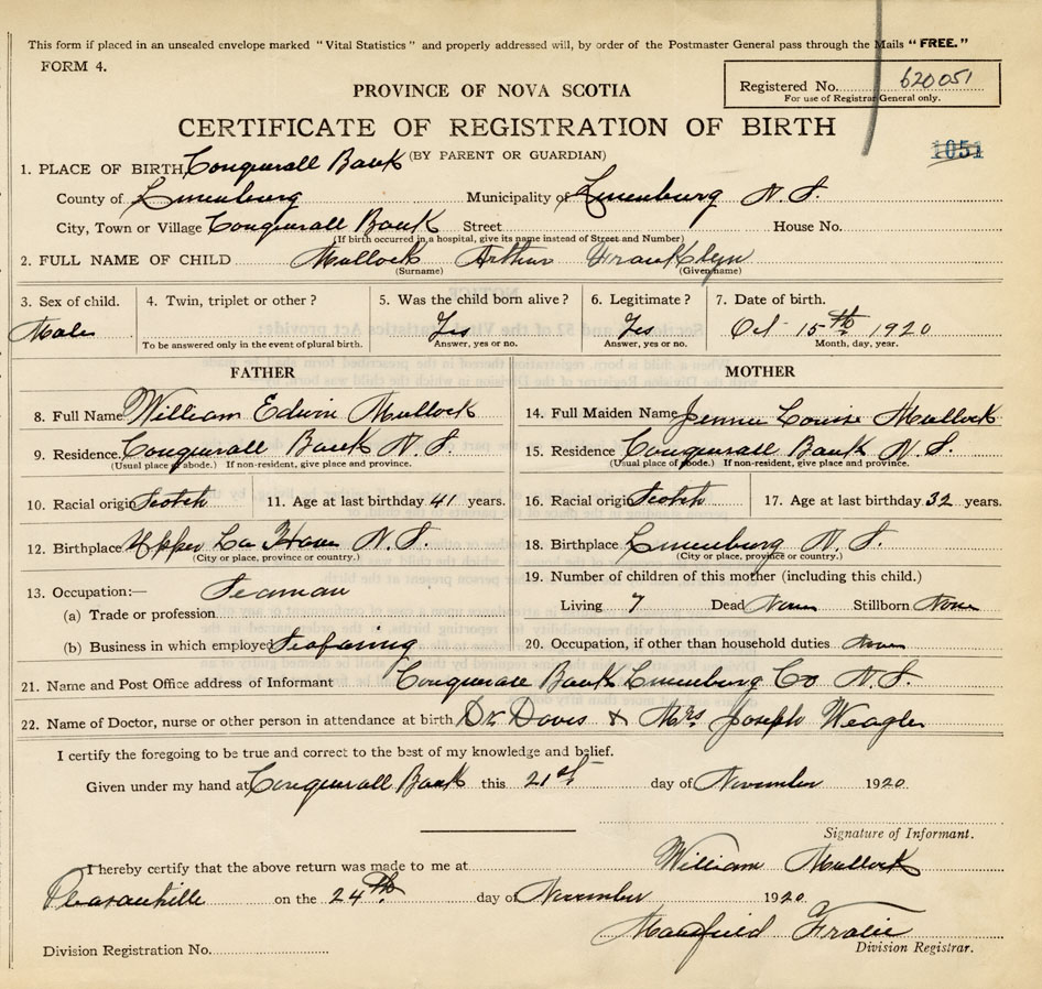 21. Name and Post Office address of Informant William Mullock Conquerall Bank Lunenburg Co N.S.
