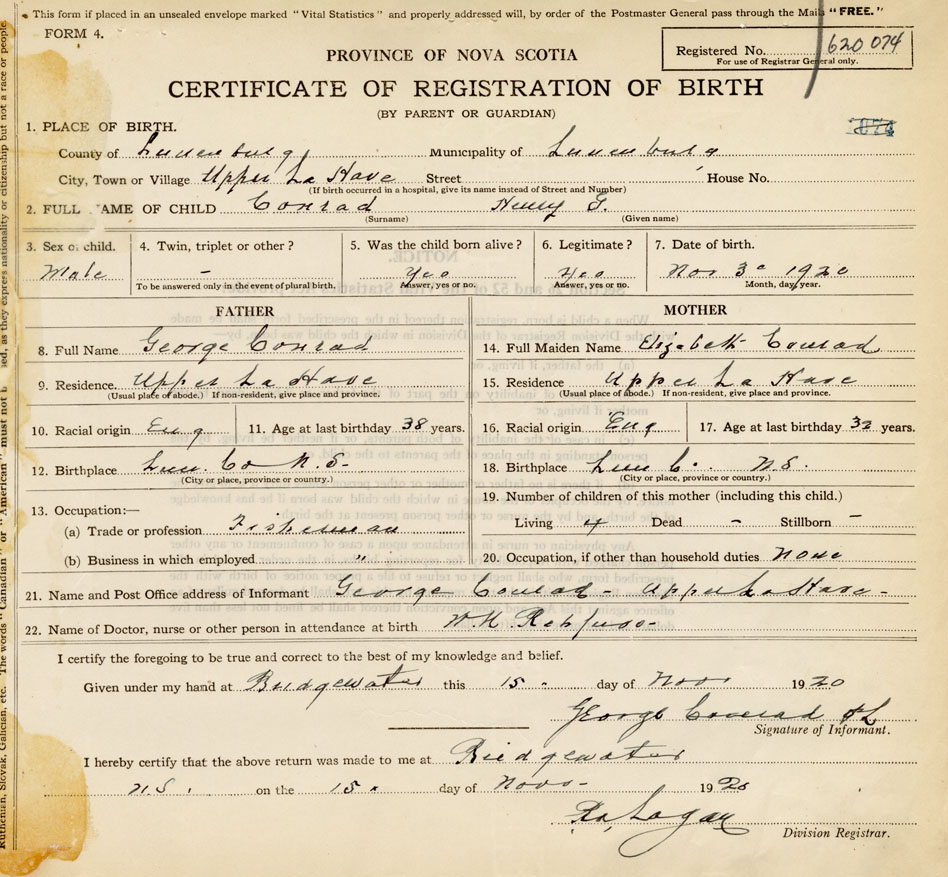 21. Name and Post Office address of Informant George Conrad Upper La Have