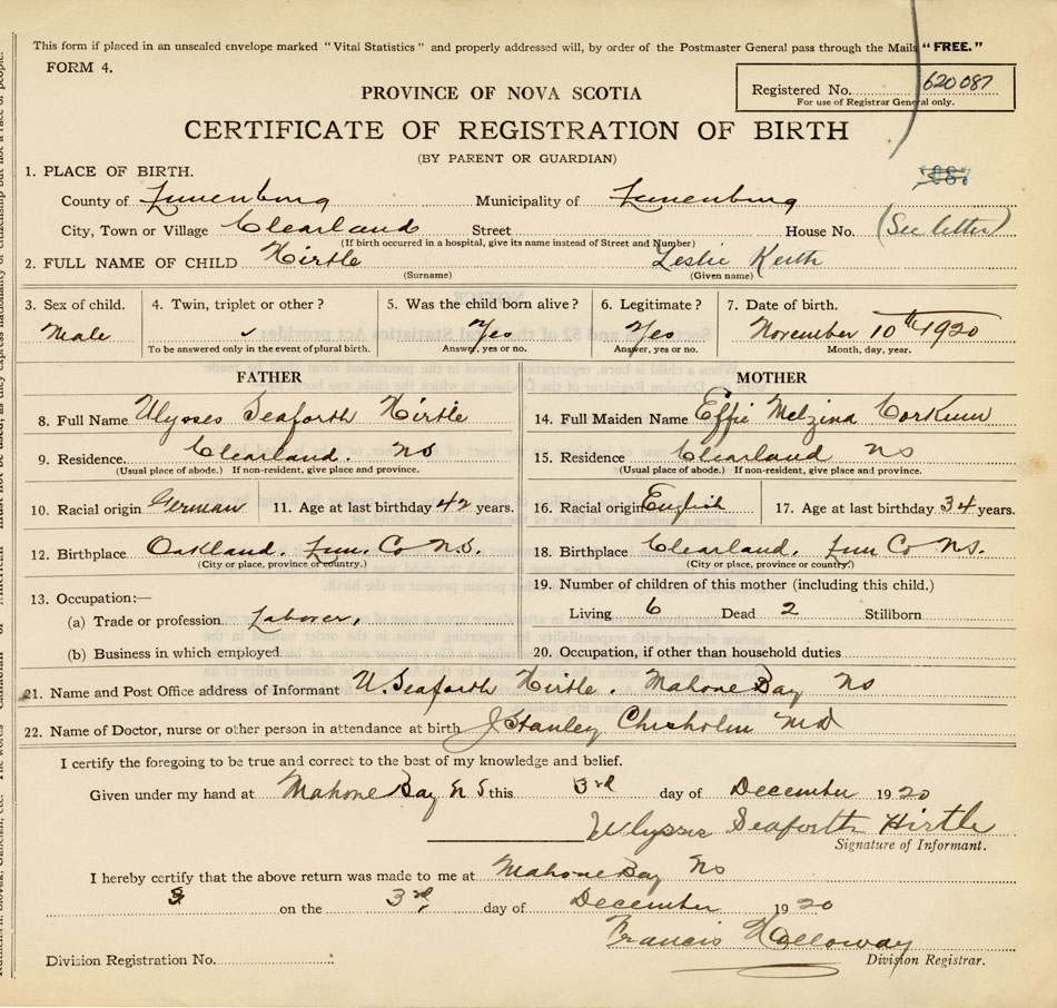 21. Name and Post Office address of Informant U. Seaforth Hirtle Mahone Bay NS