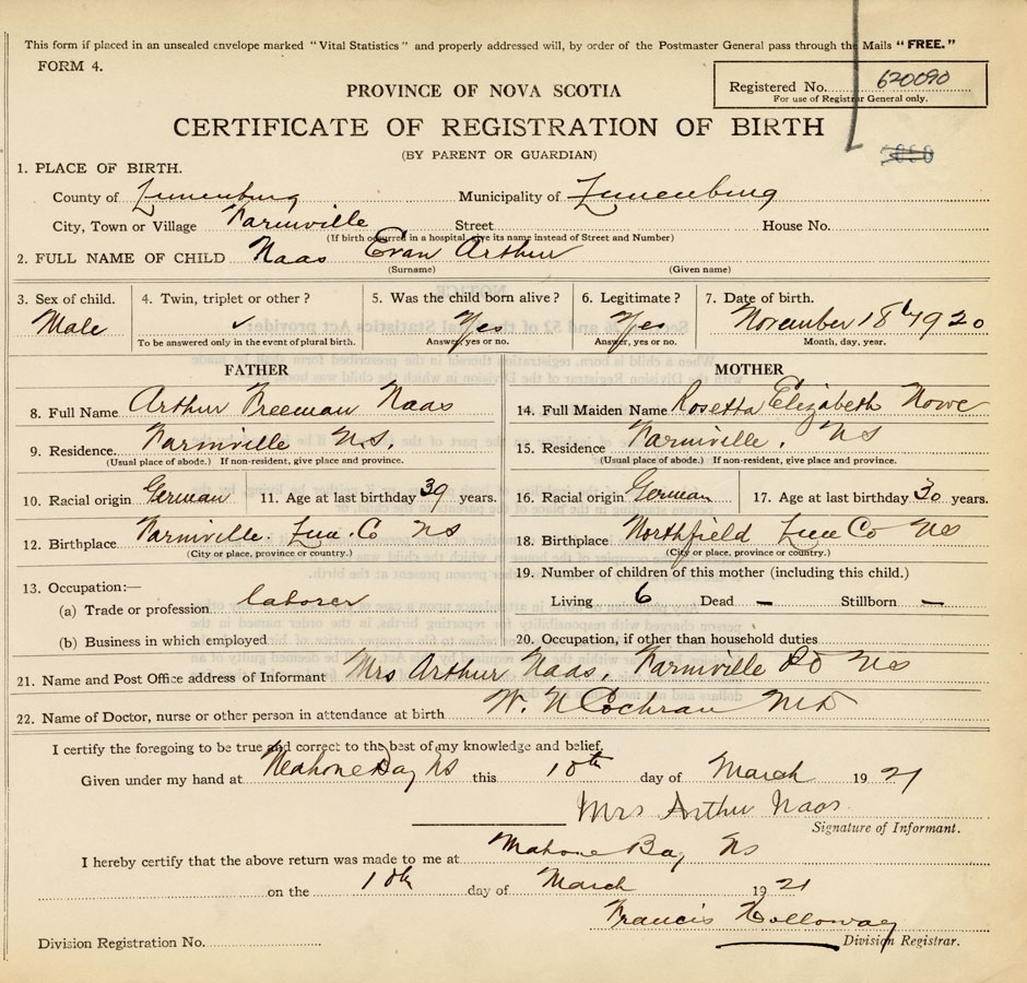 21. Name and Post Office address of Informant Mrs. Arthur Naas Farmville PO NS