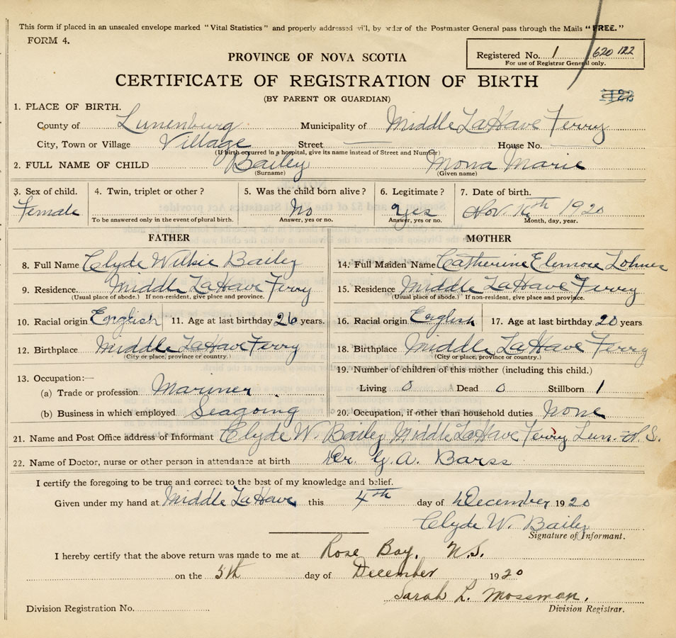 21. Name and Post Office address of Informant Clyde W. Bailey Middle LaHave Ferry Lun. N.S.
