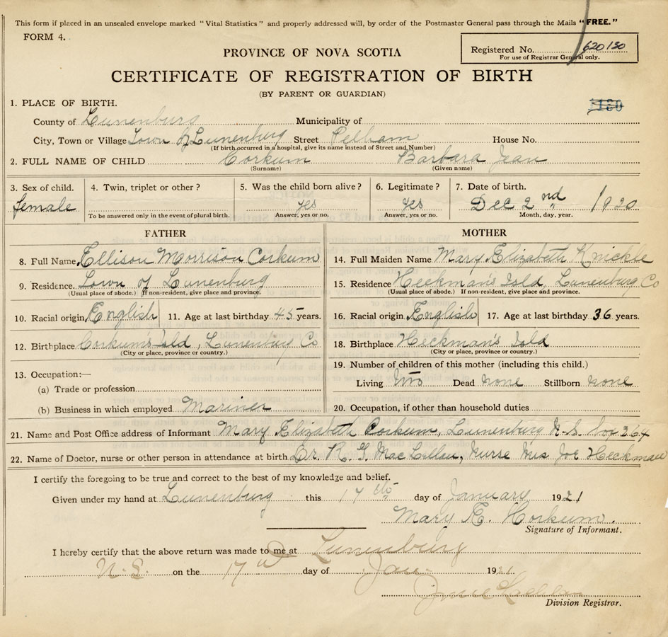 21. Name and Post Office address of Informant Mary Elizabeth Corkum Lunenburg