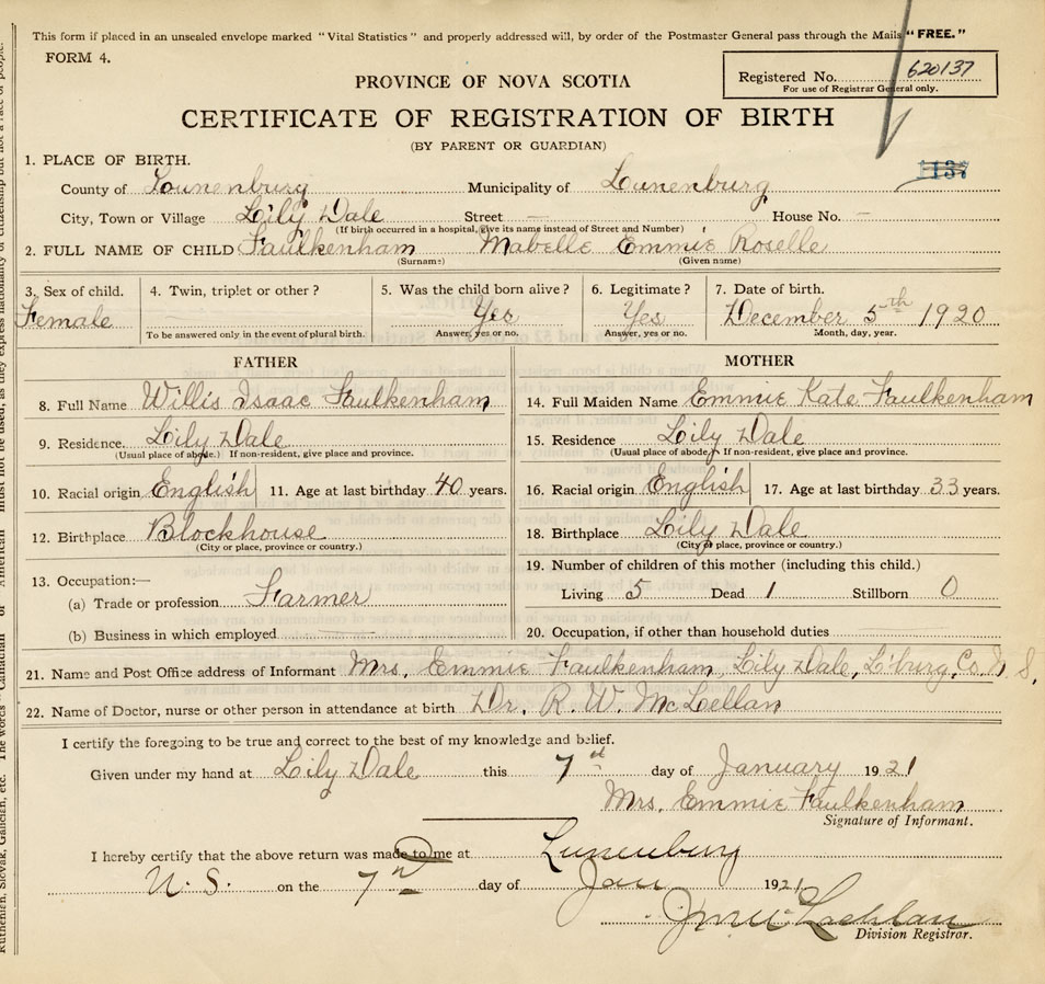 21. Name and Post Office address of Informant Mrs. Emmie Faulkenham Lilydale, Lunenburg Co. N.S.