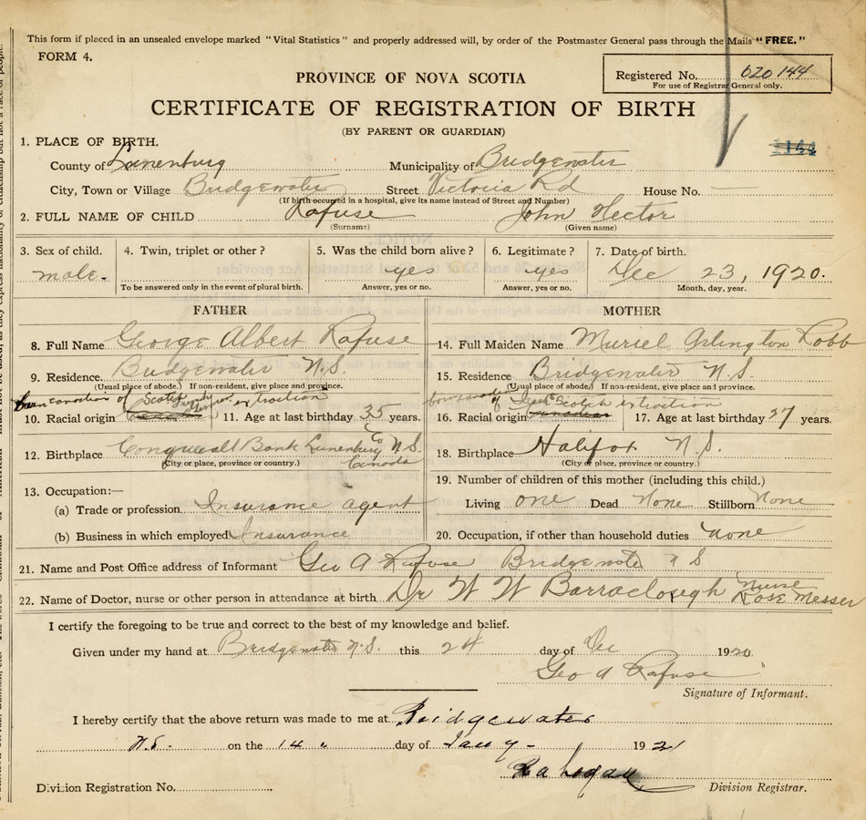 21. Name and Post Office address of Informant George A. Rafuse Bridgewater, Lunenburg Co.